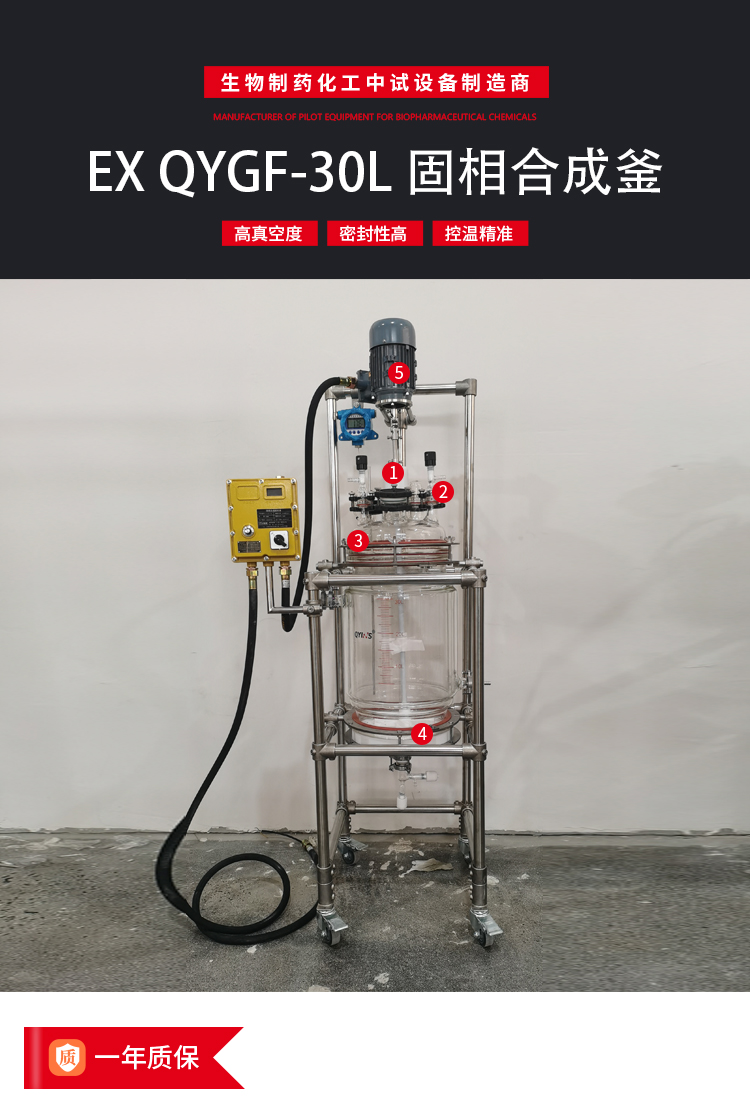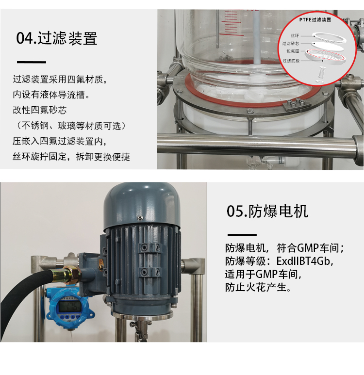 固相合成反應(yīng)釜,可實現(xiàn)合成裂解固液分離過濾以及結(jié)晶等工藝要求,可與常規(guī)反應(yīng)裝置輕松組合。使用適當?shù)倪^濾器分離漿液中的固體顆粒,形成成濾餅;濾液向下流動,從底部出口的閥門流出,過濾板多種材質(zhì),多種孔徑可選
